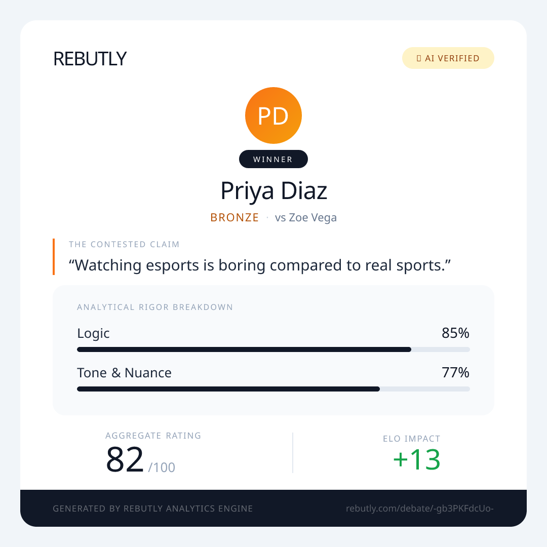 Priya Diaz winsHonestly, this claim just shows you haven't given esports a real chance. The 'confusing' screen is just a new kind of field. Once you learn the basics, it's incredibly exciting. The strategy is deeper than most real sports—it's like high-speed chess. And you absolutely can see the players' emotions! They have cameras on them, they celebrate, they get devastated. Saying you can't see it is just ignoring the production. Real sports have plenty of boring moments too. At least in esports, there's constant action.