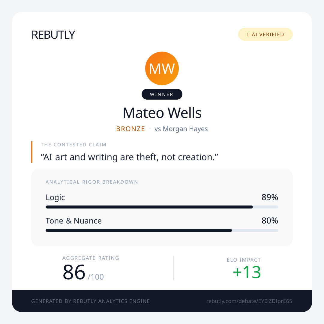 Mateo Wells winsLook, calling AI art 'theft' is just fear-mongering. It's a tool, like a fancy paintbrush. Artists have always learned by studying others' work—AI just does it faster. The thing is, you still need a human to give the prompt, to guide it, to choose the final piece. That's creative direction! Saying it's theft is like saying a musician steals because they learned chords from listening to the Beatles. It's a new form of collaboration, not robbery. Honestly, this just helps more people express ideas they couldn't before.