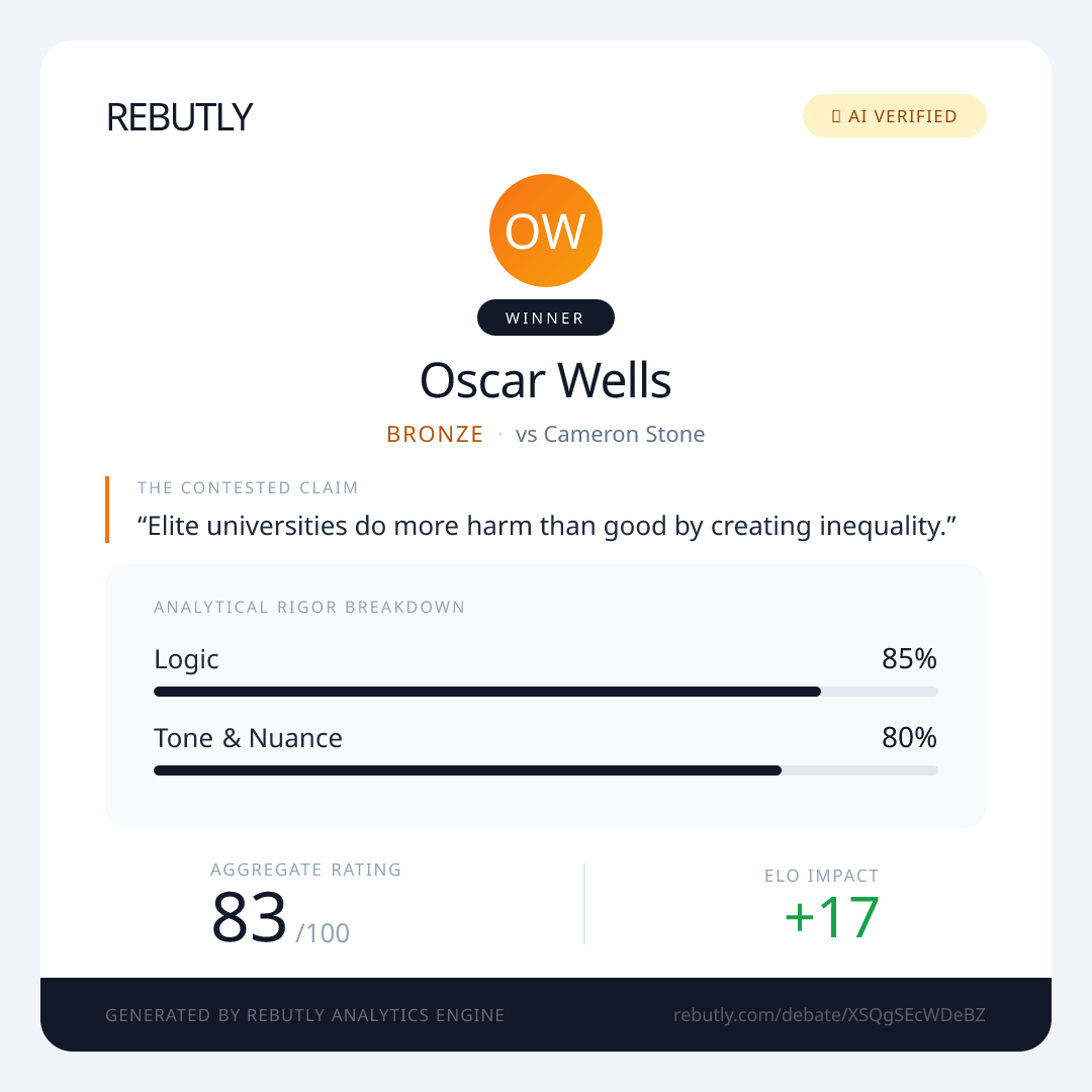Oscar Wells winsThe claim that elite universities do more harm than good is a dangerous oversimplification. These institutions are engines of social mobility, not just clubs for the rich. Look at their massive financial aid programs—Harvard is free for families earning under $85,000. They produce groundbreaking research that benefits everyone, from medical breakthroughs to technological innovation. To say they 'create' inequality ignores the real problem: systemic inequities that start in early childhood. Abolishing or demonizing these universities won't fix that; it would just deprive talented students from all backgrounds of a world-class education.