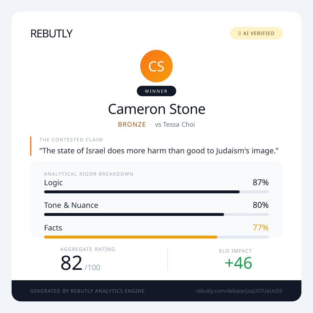 Cameron Stone winsThis claim is not only false, it's dangerous. Honestly, the state of Israel is the greatest source of pride and cultural revival for global Judaism in two millennia. Look at the facts: it's a vibrant democracy, a hub of innovation, and a safe haven from persecution. To say it damages Judaism's image is to ignore the millions who see it as a miracle, a fulfillment of ancient hope. The idea that Israel 'represents all Jews' is the real problem—it's an unfair burden placed by outsiders. We don't judge all Muslims by Saudi Arabia's policies, do we? Israel's existence strengthens Jewish identity, period.