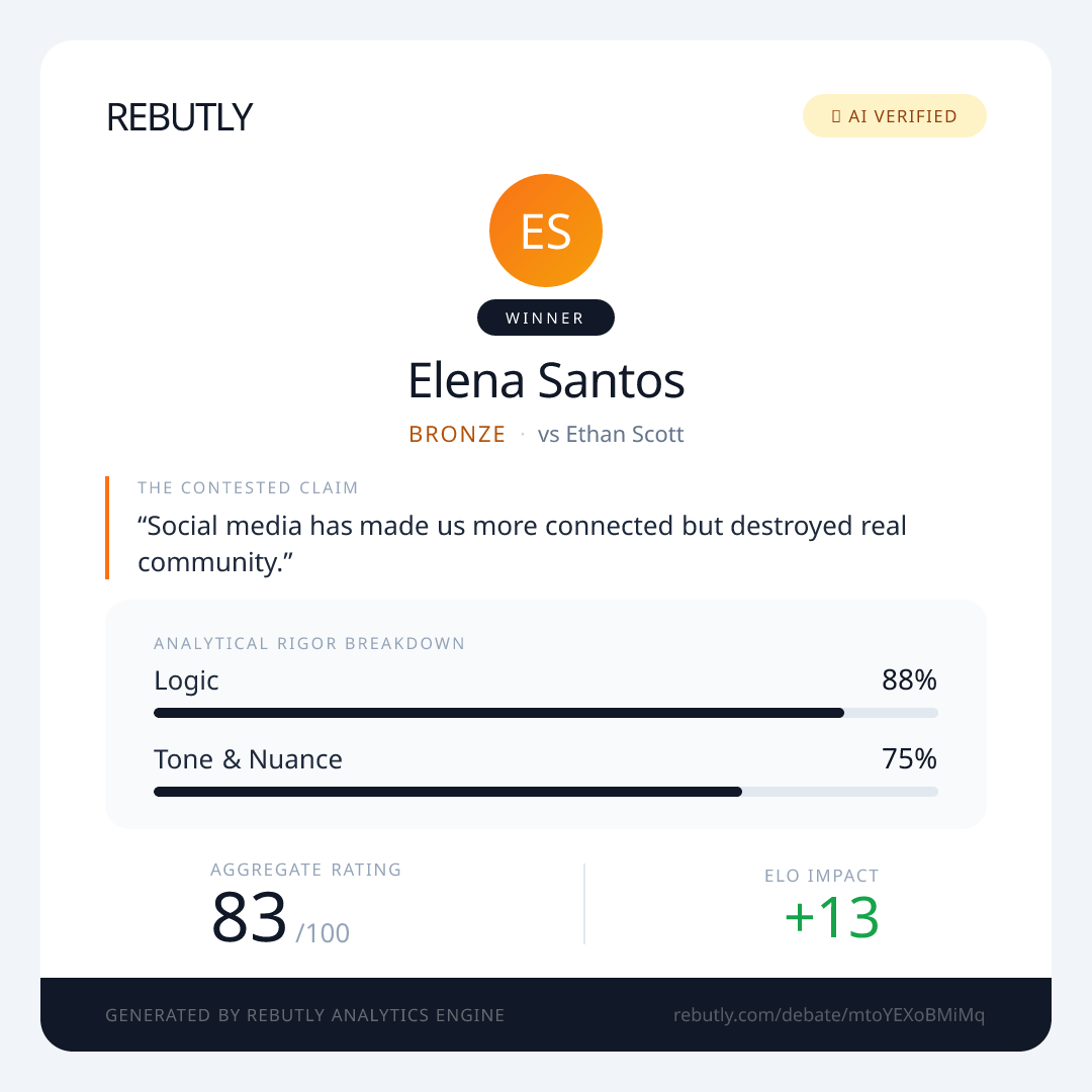 Elena Santos winsAlright, let's get this straight. The claim that social media has 'destroyed real community' is pure nostalgia, a fantasy about a past that never really existed. Social media hasn't destroyed community; it has evolved and expanded it. Look, before Facebook, how many people from your high school could you realistically stay in touch with? Maybe five? Now it's hundreds. That's not 'fake' connection—it's a lifeline for people who are isolated by geography, disability, or social anxiety. The idea that 'no one will help in a crisis' is just a cynical myth. I've seen GoFundMe campaigns raise millions for medical bills, and neighborhood Facebook groups are the first place people post about lost pets or ask to borrow a tool. Honestly, the 'real community' of the past often meant you were stuck with the people physically around you, like it or not. Now we can find our tribes—fellow hobbyists, support groups, activists—globally. That's a deeper, richer form of connection, not a shallower one.